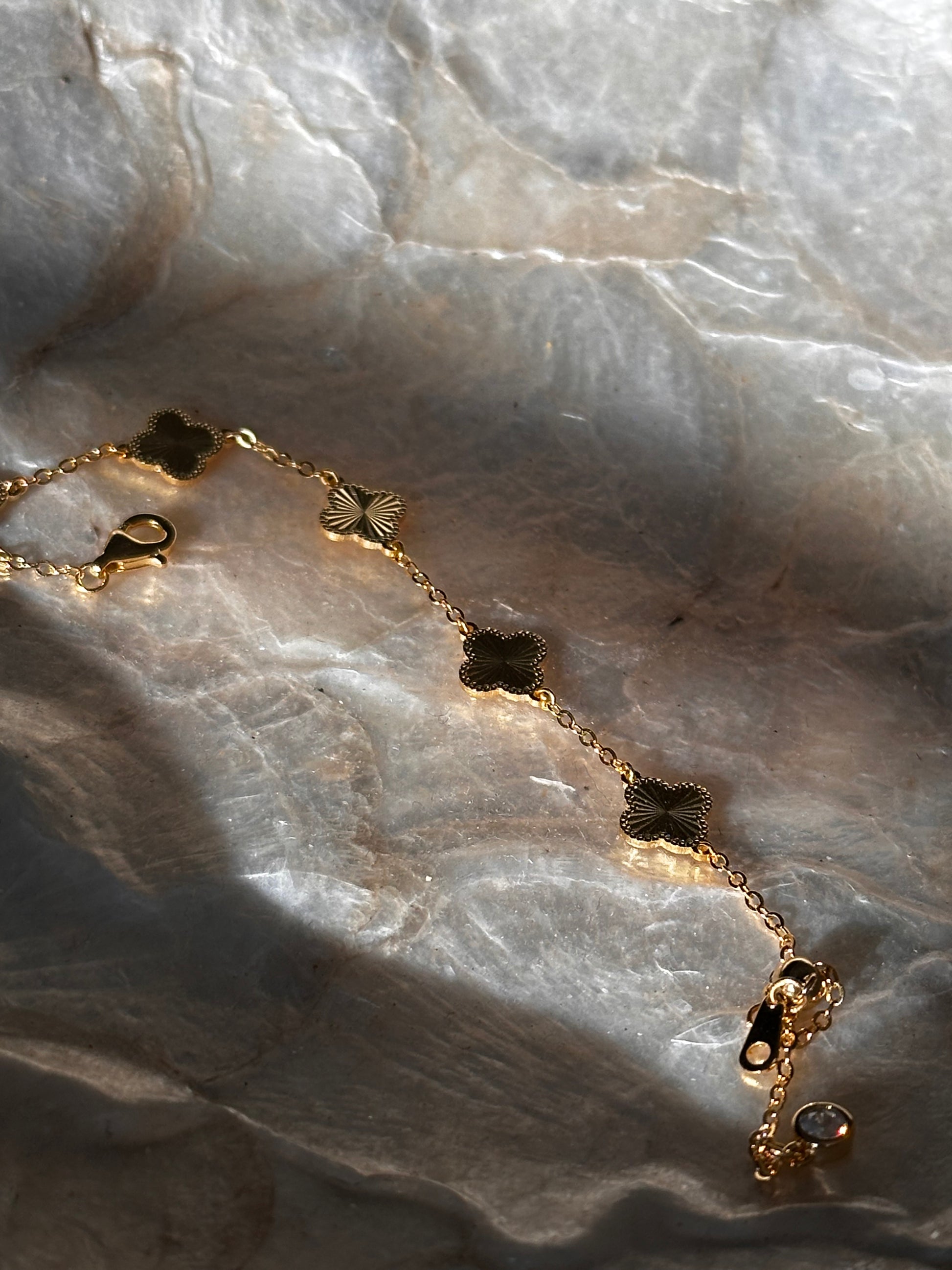 Hand-crafted in 925 sterling silver and finished with a luminous layer of 18k gold plating, this bracelet features a sequence of textured clover motifs designed to catch the light with every movement.